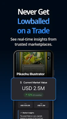 Cardly revolucionārā kāršu atpazīšanas tehnoloģija dažu sekunžu laikā identificē galvenās detaļas, piemēram, nosaukumu, izdevumu, retumu un kārts numuru gan populārākajām kolekcionējamajām kāršu spēlēm (TCG), gan sporta kartēm. Neatkarīgi no tā, vai tas ir reti sastopams Pokémon holograms vai profesionāli novērtēta basketbola karte, Cardly nodrošina zibenīgus un precīzus skenējumus. Turklāt Cardly sniedz reāllaika tirgus datus un vērtēšanas atsauces no uzticamiem avotiem. Jūs nekad vairs nebūsiet neziņā par savu kāršu patieso vērtību, redzot zemākās un vidējās tirgus cenas, vēsturiskās tendences, cenu diagrammas un aptuveno visas kolekcijas vērtību. Uzziniet arī par PSA, BGS un SGC novērtējumu līmeņiem, kas palīdzēs nekad nepārmaksāt vai nenovērtēt par zemu savas kāršu vērtības.